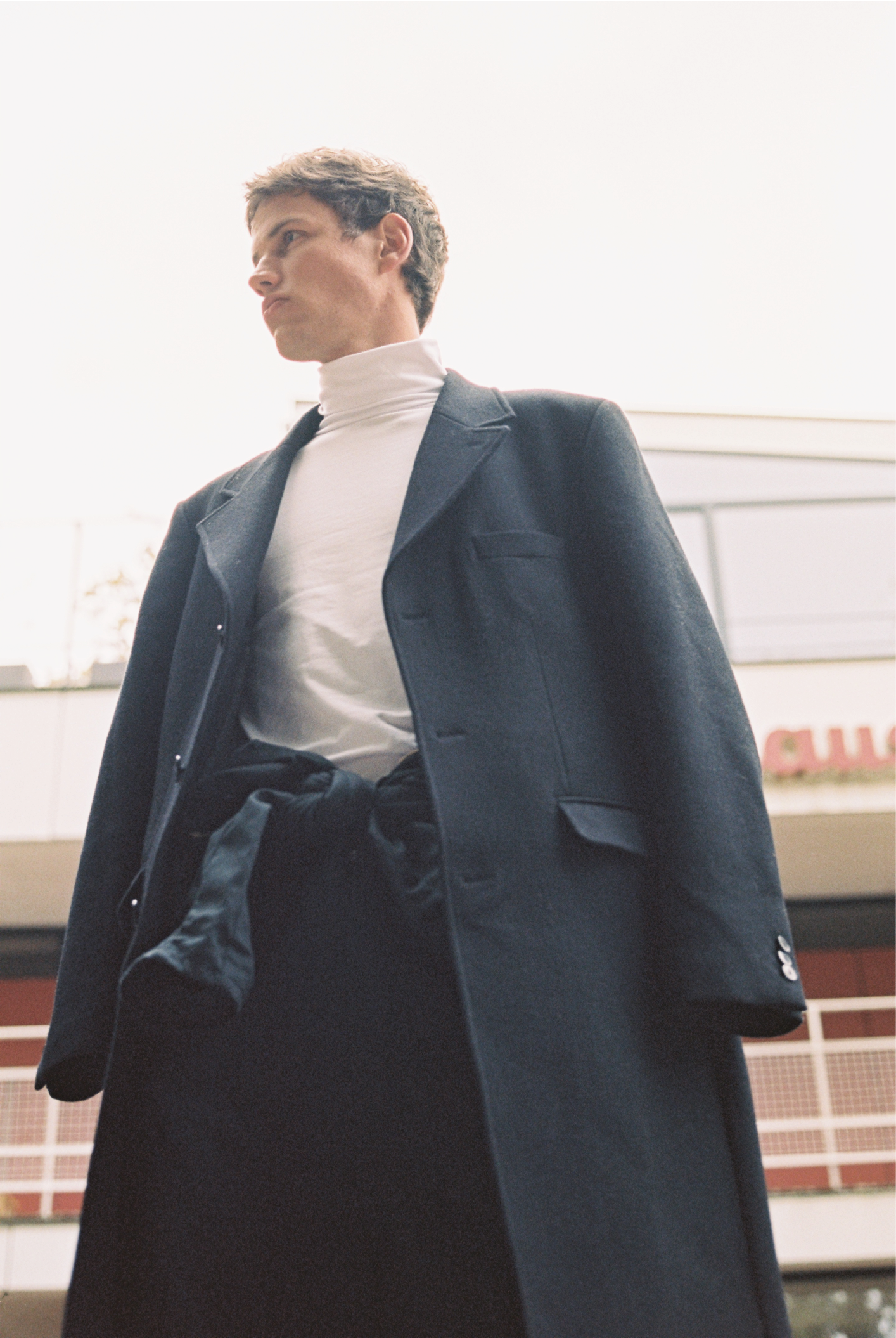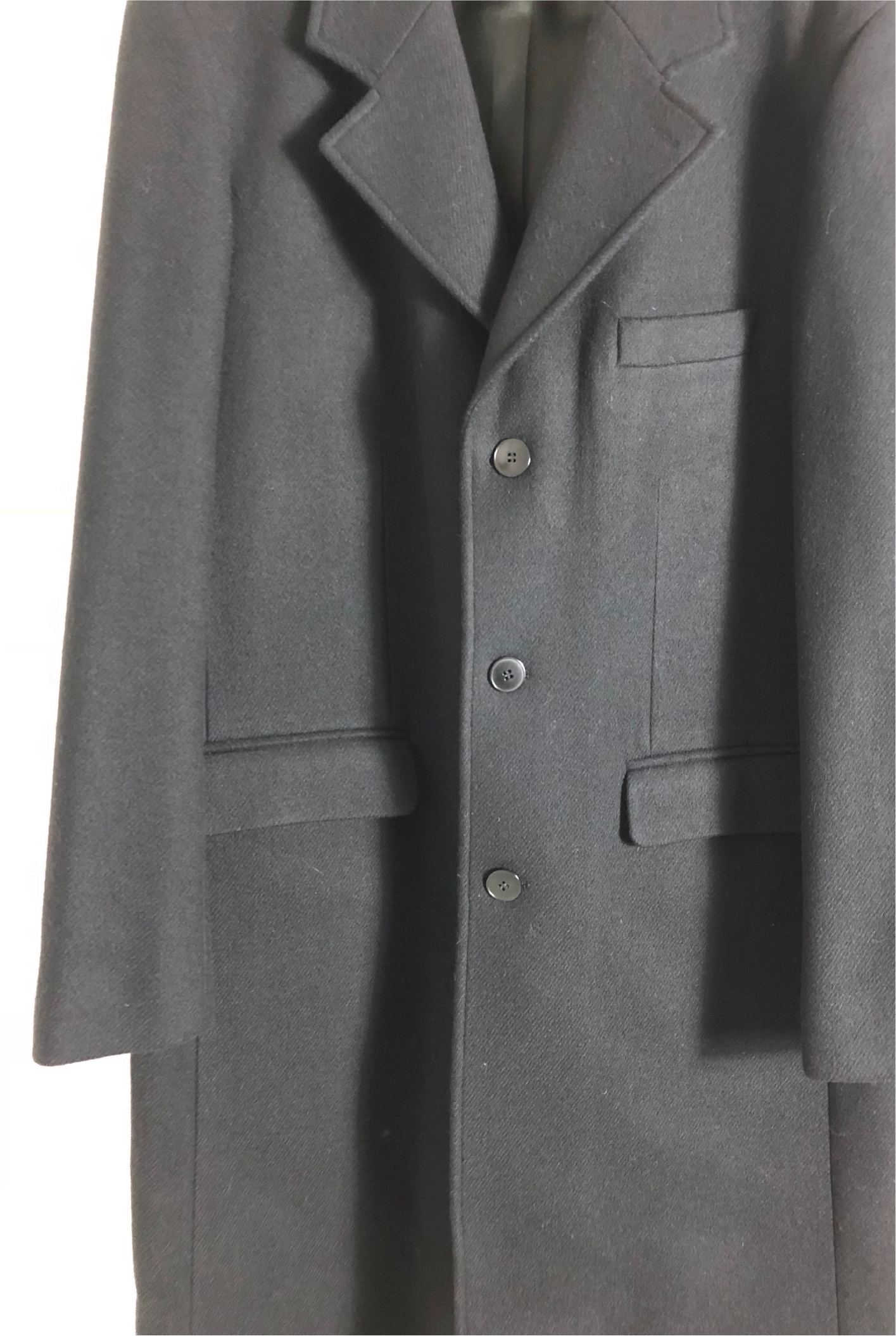 Agnès b black long wool coat, notched lapel collar, lined, three buttoned sleeves. Welt chest pocket, two inside pockets, two flap side pockets. Made in France. Sleeve length: 65cm Back length: 106cm Shoulders: 52cm Size: M/L 85% wool 15% nylon polyamide lining: 88% acetate 32% rayon. Good condition. Please see photos for full evaluation. OUT OF STOCK.