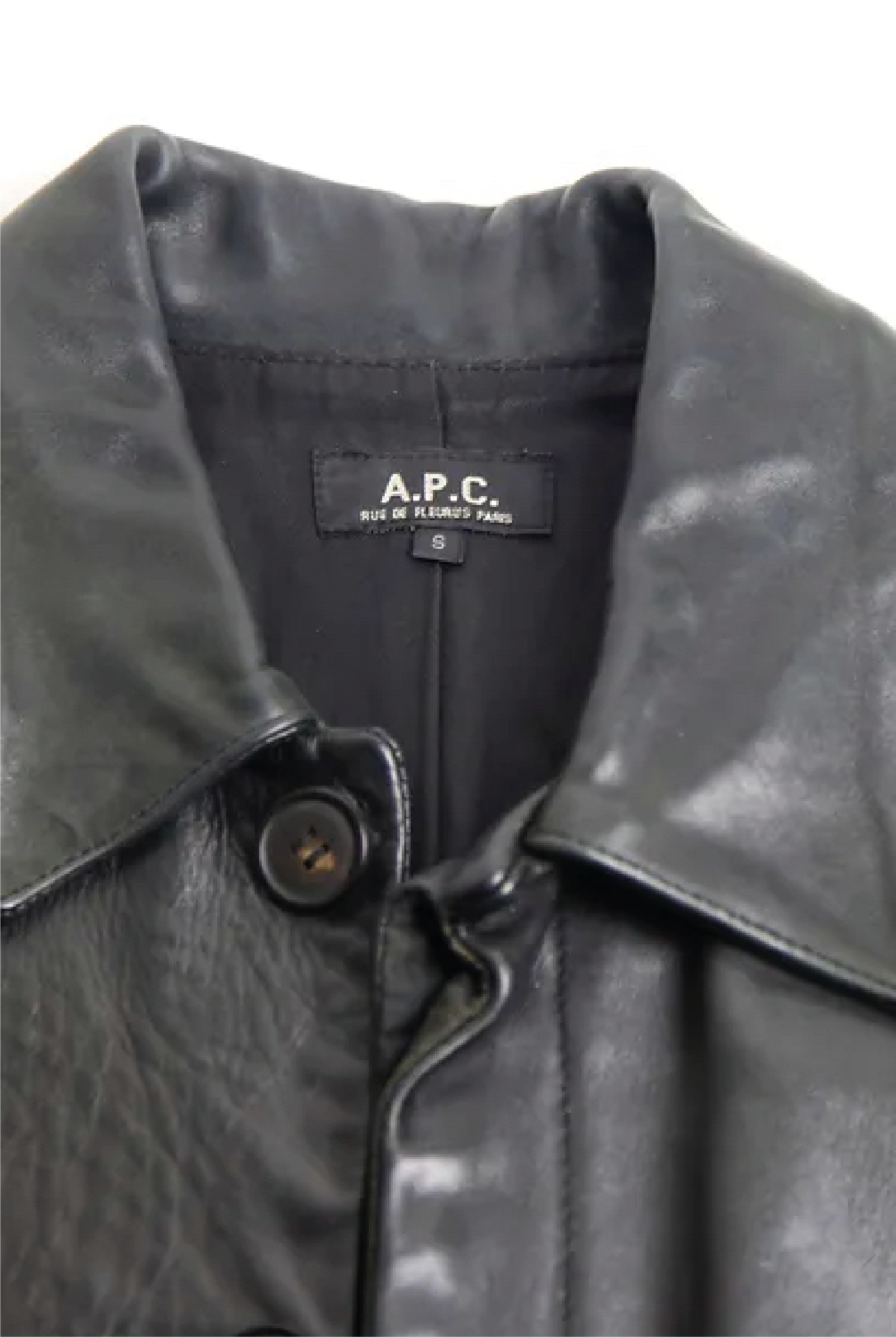 Black APC lined coat, concealed five button fastening at front, two side pockets, classic collar. Sleeve lenght: 61cm Back lenght: 90cm Shoulders: 46cm Size: Medium 100% genuine leather. Good condition. Please see photos for full evaluation. OUT OF STOCK.