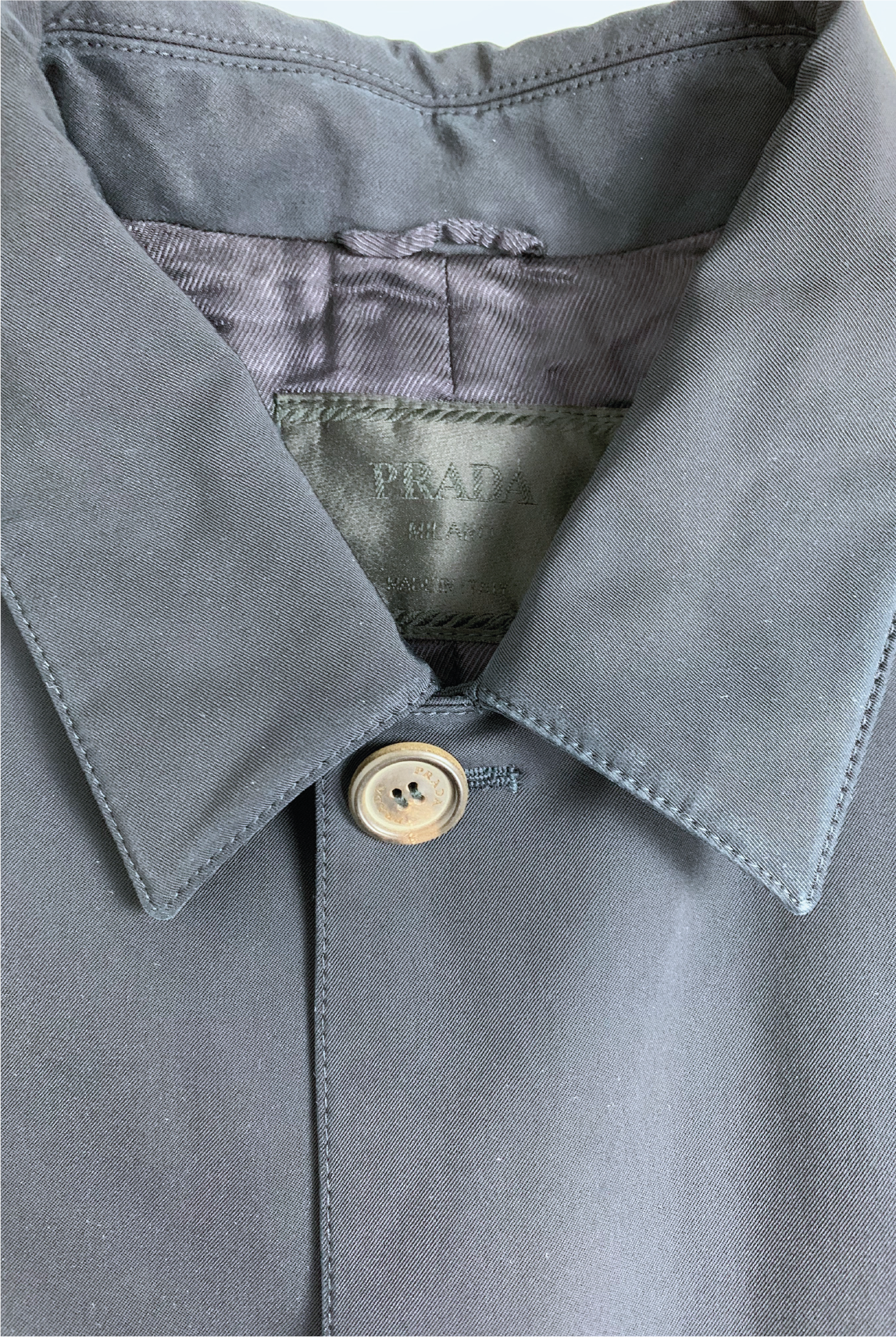 Prada dark navy blue coat, notched lapel collar, lined, two-button front closure. Two piped pockets with zipper on the front, two piped pockets inside.Sleeve length: 63cm Back length: 100cm Shoulders: 50cm Size: L 90% polyester 10% elasthane Lining: 100% polyester Good condition. Please see photos for full evaluation. PURCHASE HERE.