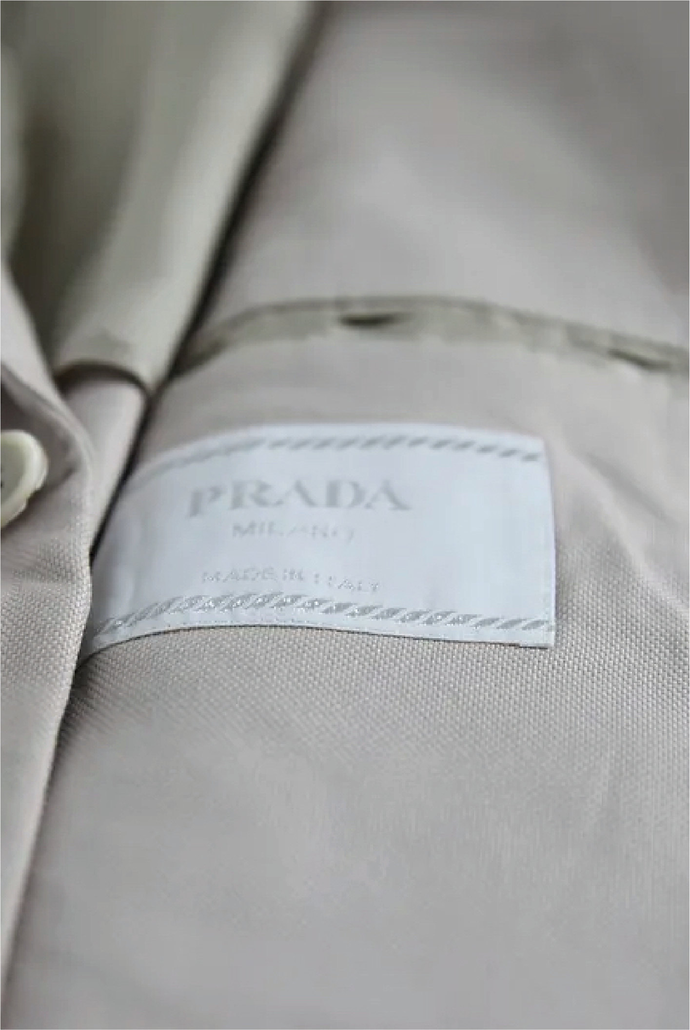 Beige Prada lined linen, three button closure at front, two side pockets, four button cuff, two interior pockets, one pocket at front.
