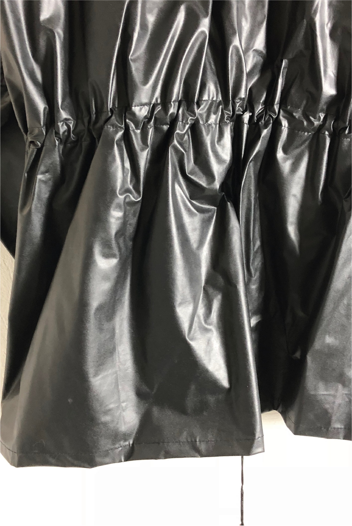PVC black shiny raincoat, elastic waist, two side pockets, fixed hood. Sleeve length: 63cm Back length: 89cm Shoulders: 48cm Size: M 100% PVC Good condition. Please see photos for full evaluation. OUT OF STOCK.